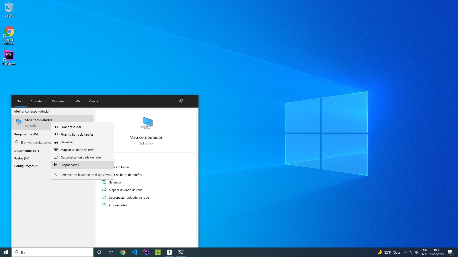 Feito isso, precisamos adicionar o caminho dos binários globais do composer no PATH do Windows. Primeiramente acesse o menu propriedades do Meu Computador, como mostrado abaixo: