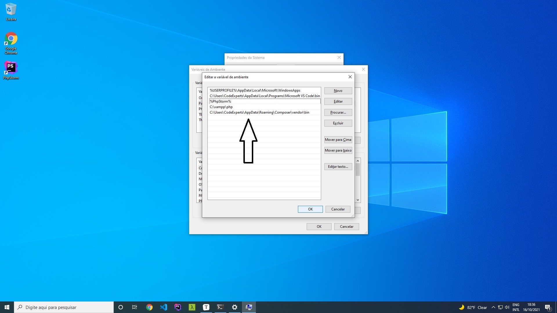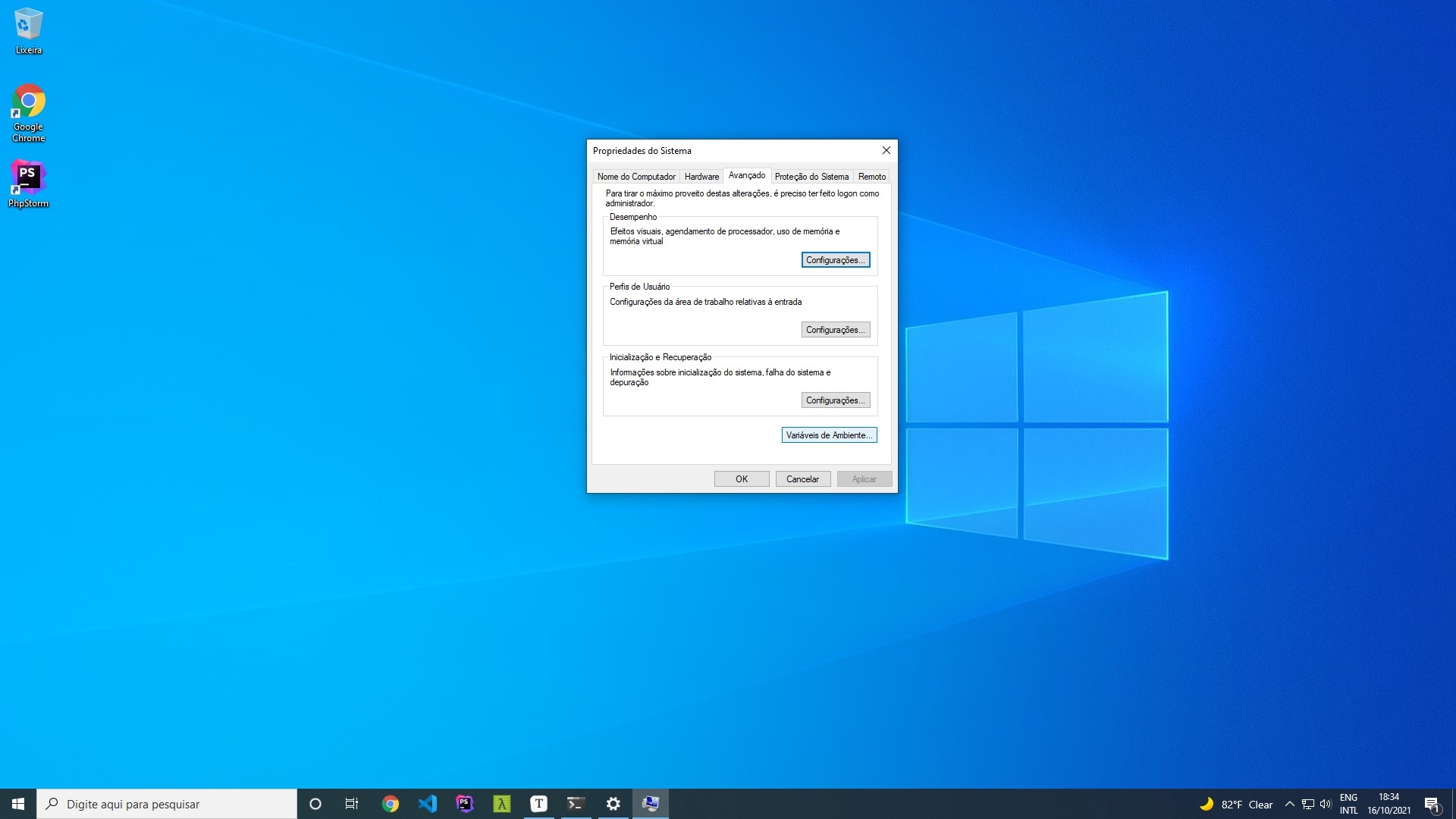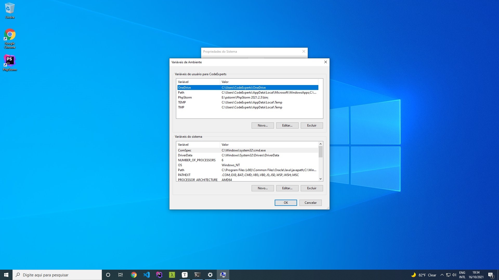 Na tela que aparecer, na parte inferior, acesse o menu Variáveis de Ambiente.