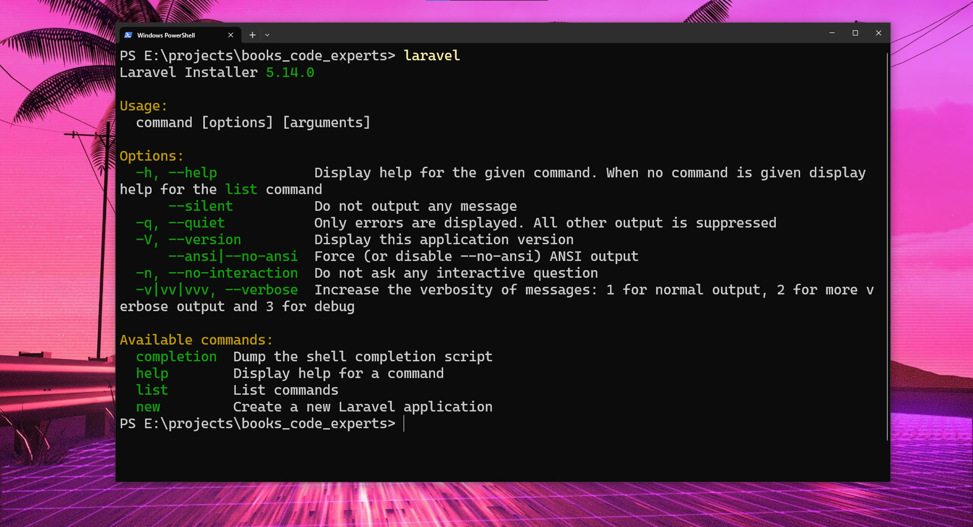 Para verificar se o laravel installer é reconhecido, execute em seu cmd o comando: laravel, dê ENTER e obtenha o resultado abaixo: