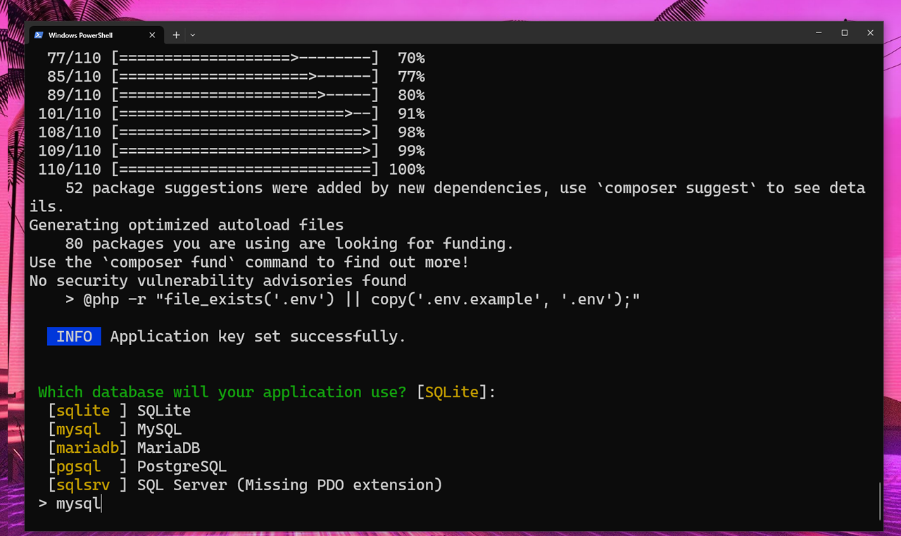 Durante o passo de instalação o Laravel Installer abrirá um opção para selecionarmos o banco de escolha, por padrão o drive do banco é SQlite mas vamos optar pelo MySQL, basta digitar como na imagem e dá ENTER. Veja abaixo: